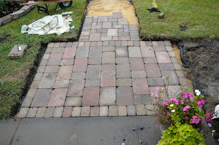 I wanted a large area near the sidewalk, so I widened the path. I have a curved bench to put in one corner and hope to find some nice planters for the corners.